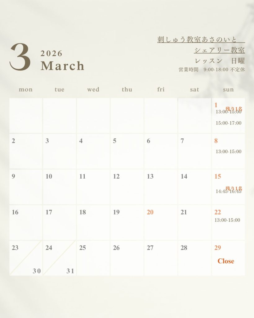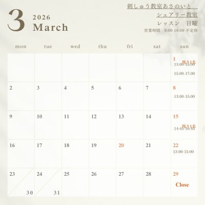 刺しゅう教室あさのいとは、基本毎週日曜の午後に、spaceシェアリーでレッスンを開催しています。