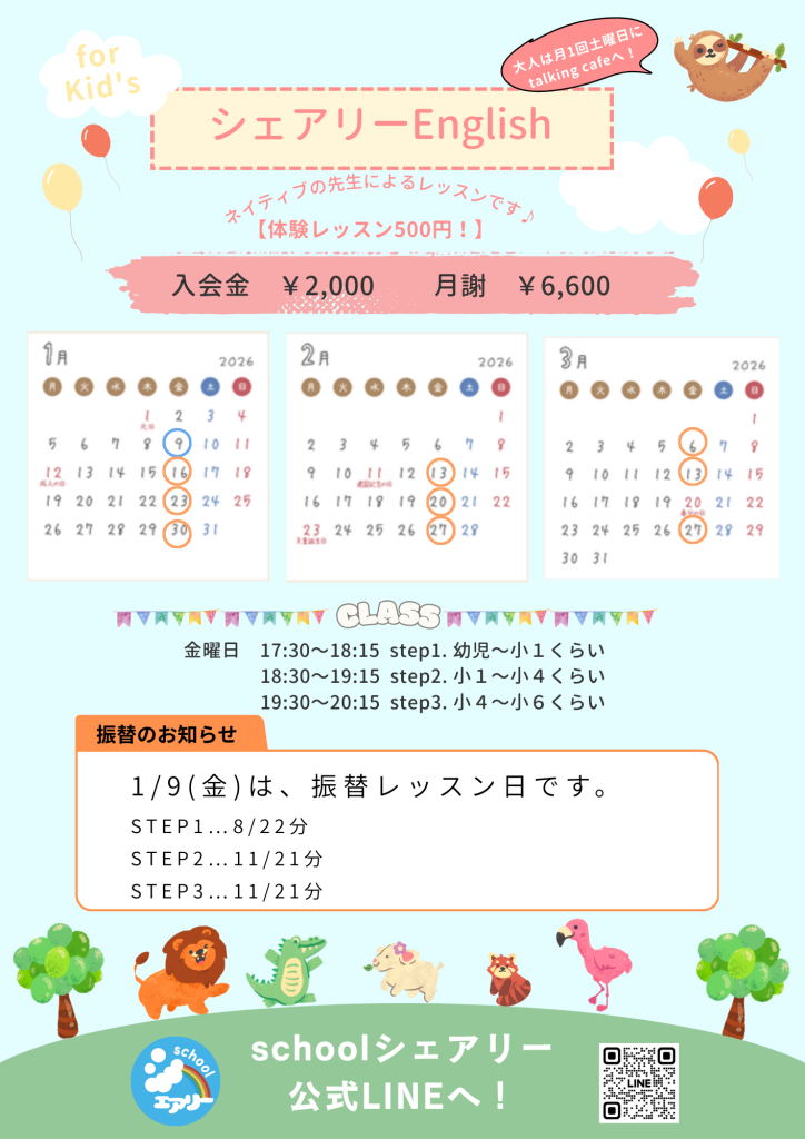 シェアリーEnglishより、2026年1月〜3月のレッスン日程および振替レッスンのお知らせです。